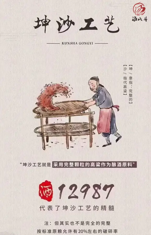 定义 | 大曲坤沙工艺:茅台镇酱香酒传统工艺,以完整高粱(坤沙)为原料,一年为一个生产周期,经9次蒸煮、8次发酵、7次取酒,俗称"12987",是公认的酱香酒高端工艺标准。